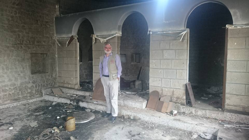 One of the first buildings you come across in Qasab is the remains of the Church. (This was a Christian village. The village was occupied in 2012 and destroyed as the terrorists were being driven back by the Syrian Arab Army 18 months ago. The Church is a poignant sight. The font and the altar has been smashed to pieces. Icons have either been destroyed or sold. The curtain veil to the sanctuary lies burned and dusty on the floor. It is a very poignant sight – and very real. On the outside walls are written in Arabic – ‘freedom’- ‘mosque’. I found my emotions welling up in the tragic silence… And a deep seething anger that the mixed terrorist groups who perpetrated this are still called ‘moderate’ by our government. Behold my friends, the face of ‘rebel’ ‘freedom’ and ‘democracy’.